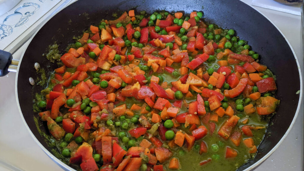 Añadir: el agua y cuando rompa el hervor de arroz, lavado y seco. Tapar la olla y cocer 17 minutos, agregar las arvejitas.